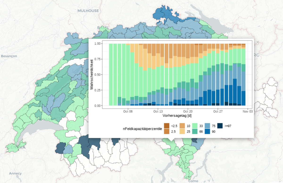 Als Indikator für die Bodenfeuchte wird die nutzbare Feldkapazität [%] abgebildet, welche mit dem hydrologischen Modell PREVAH berechnet wird und den Anteil an Wasser im Boden darstellt, welche für Pflanzen verfügbar im Boden gespeichert werden kann. Da diese Grösse vorwiegend für Flächen mit entsprechender Mächtigkeit des Bodens von Relevanz ist, sind alpine Einzugsgebiete (Gebietsschwerpunkt grösser 1200 m ü.M.) in der Darstellung ausgenommen. Die Klassengrenzen (Quantilen) sind dabei mit Hilfe einer Langzeitsimulation über 30 Jahre berechnet worden und die Wahrscheinlichkeit für das Eintreffen einer bestimmten Klasse wird durch die Verwendung der Ensemblevorhersage ermöglicht (Anzahl der Ensemblemember in der vorhergesagten Klasse / Anzahl der möglichen Ensemblemember (51)).