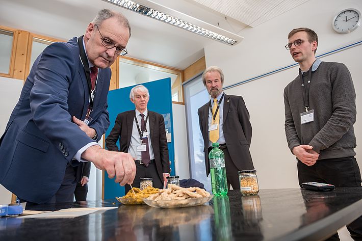 Federal Councillors Guy Parmelin and Konrad Steffen trying out a novel meat replacement product at an event on spin-offs and start-ups of the ETH Domain in January 2020 (Photo: Mallaun Photography)