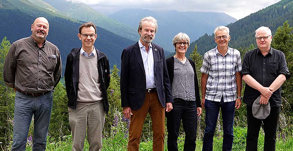 Konrad Steffen in the circle of the WSL management (July 2020). From left to right Andreas Rigling, Christoph Hegg, Konrad Steffen, Anna Hersperger, Jürg Schweizer, Rolf Holderegger (Photo: WSL)