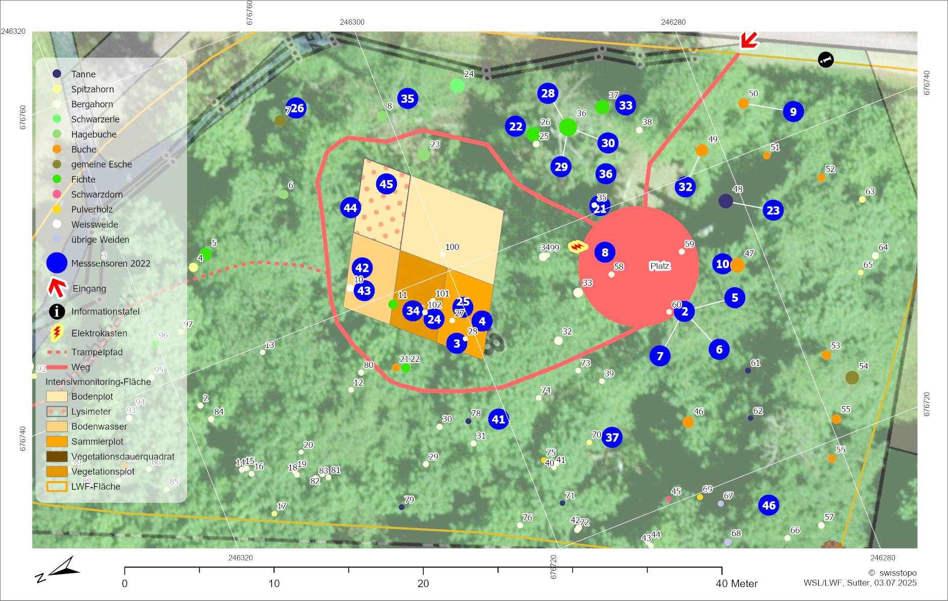 Um interessierten Personen seine Forschungsprojekte und über 30 Messinstrumente, Sensoren und Sammler zu zeigen und zu erklären, hat das Forschungsprogramm LWF in Birmensdorf eine Test-, Schulungs- und Demonstrationsanlage eingerichtet (Abb. 1). Neben Schulung, z.B. Junior Research und Vorführung, testen wir hier auch neue Messmethoden und Instrumente.