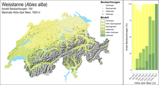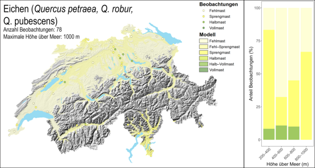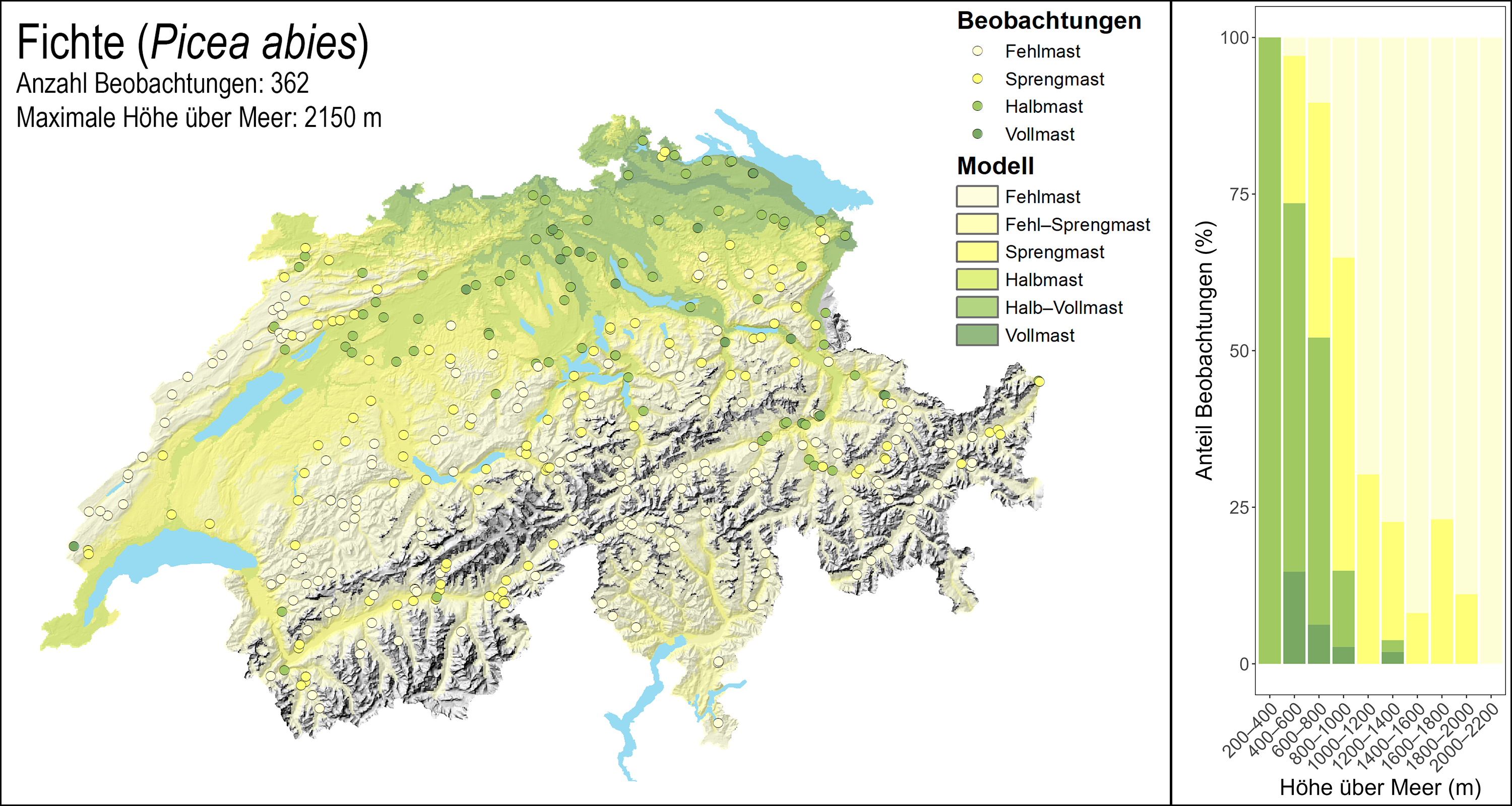 Die Samenproduktion war bei Buche und Eiche fehlend oder gering (Fehl- und Sprengmast), bei Fichte und Weisstanne entsprechend der Höhenstufe unterschiedlich stark (Halb- oder Vollmast). Bei der Buche wurden landesweit keine Früchte (Fehlmast) und bei der Eiche generell wenig Früchte (Sprengmast) festgestellt. Nur im Raum Aargau/Zürich wurden Halb- oder Vollmast gemeldet wurden. Die Fichten produzierte vor allem in den östlichen Teilen der Alpennordseite viele Zapfen in den Tieflagen bis 800 m ü. M. (Halbmast bis Vollmast). Für die Weisstanne wurden Halb- und Vollmast vermehrt in höheren Lagen ab 800 m ü. M. und in der Westschweiz notiert.
