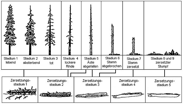 Der hohe ökologische Wert von Totholz steht in Zusammenhang mit dessen enormer Formenvielfalt. Dabei kann es sich um stehende oder liegende Baumstämme handeln, um ganze Bäume oder um Teile davon wie abgestorbene Äste oder Baumstrünke oder gar um Asthaufen am Boden. Hier ein kurzer Überblick (Quelle: Brede et al., 2000):