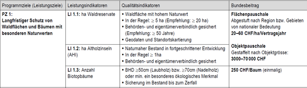 Der Bund gibt den Kantonen einen Beitrag für die Erreichung der Ziele der Programmvereinbarung. Der Bundesbeitrag für das Programmziel 1 „Langfristiger Schutz von Waldfläche und Bäumen mit besonderen Naturwerten“ in einem kantonalen Programm für neu ausgeschiedene Waldreservate, Altholzinseln oder Habitatbäume, ist in folgender Tabelle ersichtlich.