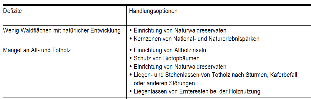 Die Defizite und Handlungsoptionen im Bereich Totholz und Habitatbäume: